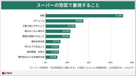 スーパーの惣菜を購入する際に重視していることは「価格」(71.6%)が圧倒的に多い結果となりました。物価高で食費増大が気になる中、惣菜の価格もシビアに判断されているようです。