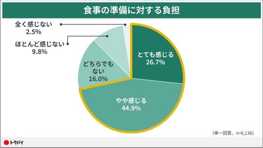 ふだんの食事の準備に対して作業負担や心的負担をどの程度感じているかを聞いたところ、「とても感じる」(26.7%)、「やや感じる」(44.9%)を合わせた7割以上が「負担を感じる」と回答しました。