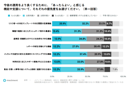 優先度高い(もっとも高い・比較的高い)と希望する機能・支援は、「リスク者への対応テンプレートや対応履歴の記録管理(53.0%)」「メンタルや生産性の変化を長期的にモニタリングできる機能(49.6%)」「産業医・保健師とのやりとりを効率化できる機能(48.7%)」。