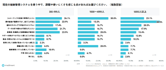 全規模で共通した課題は「フォローアップの記録や管理がしにくい」ことであり、産業医面談や高リスク者対応後の記録管理に共通した使いにくさがあることが分かる。