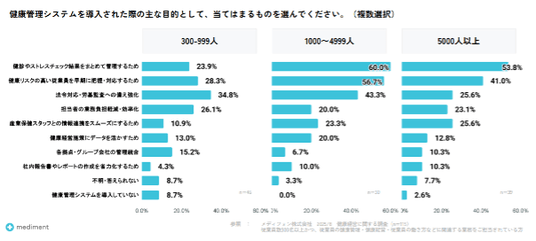 小規模企業(300-999人)は「法令対応・労基監査への備え強化」といった基礎固めの目的が強いのに対し、中規模企業(1,000-4,999人)では健診/ストレスチェックの収集・管理や、高リスク者の把握・対応の指標が高くなっている。