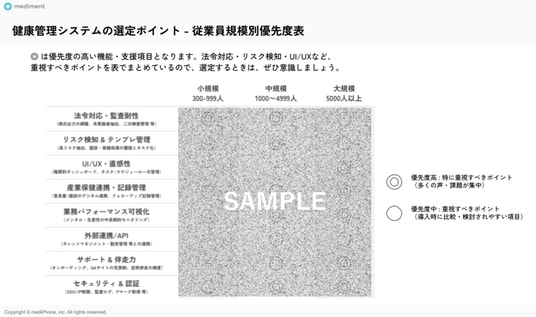 小規模企業(300-999人)はまず法令対応を優先し、中規模企業(1,000-4,999人)では、健診・ストレスチェックなどのデータ集約と高リスク者の把握が急務となっています。さらに大規模企業(5,000人以上)ではさらに産業医や保健師との連携強化が課題となっています。