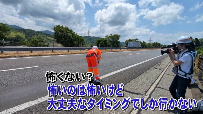 「怖いのは怖いけど、自分が必ず大丈夫というタイミングでしか行かない」という。1人が監視し、通行車両の状況をインカムで連携しながら、2人の目で確認して作業する緊張感に満ちた現場だ。