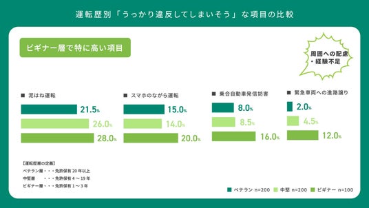 ●また、「スマホのながら運転」については、ベテラン層15.0%と比較して、ビギナー層20.0%となり、ビギナー層での「うっかり違反」リスクが高いことがわかりました。