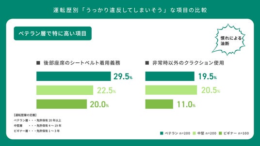 ●ベテラン層で最も「つい違反してしまいそう」との回答が多かった「後部座席のシートベルト着用義務」については、ビギナー層20.0%、中堅層22.5%、ベテラン層29.5%と、運転歴が長いほど回答率が上昇する傾向となりました。