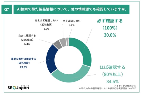 AI検索を利用している層の64.5%が「他の情報源でも確認する」と回答しており、慎重な姿勢が標準化していることも判明しました。