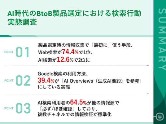 その結果、製品選定の初動で最も利用されるのは依然としてWeb検索(74.4%)である一方、5年前にはなかったAI検索(12.6%)が第2位に浮上。さらにAI検索を使う人の6割以上が他の情報源で再確認するなど、検索行動に変化が見られました。