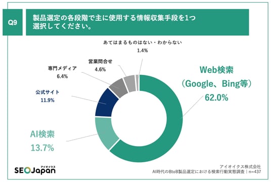 「Q9.製品選定の各段階で主に使用する情報収集手段を1つ選択してください。」(n=437)と質問したところ、「Web検索(Google、Bing等)」が62.0%、「AI検索」が13.7%という回答となりました。
