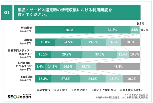企業のSEOを20年以上にわたり支援するアイオイクス株式会社(本社:東京都渋谷区、代表取締役:滝日伴則)が展開するSEO情報メディア「SEO Japan」は、BtoB製品の選定に関わる会社員・経営層437名を対象に、検索行動の実態調査を実施しました。