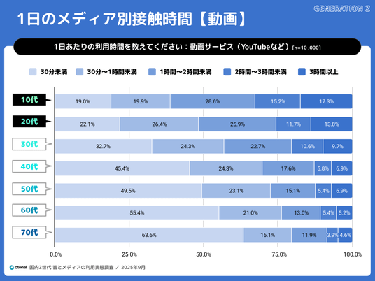 動画サービスの接触時間は、若年層ほど長い傾向がみられます。特に10代と20代では、過半数が1日1時間以上利用しており、活発な利用実態がうかがえます。