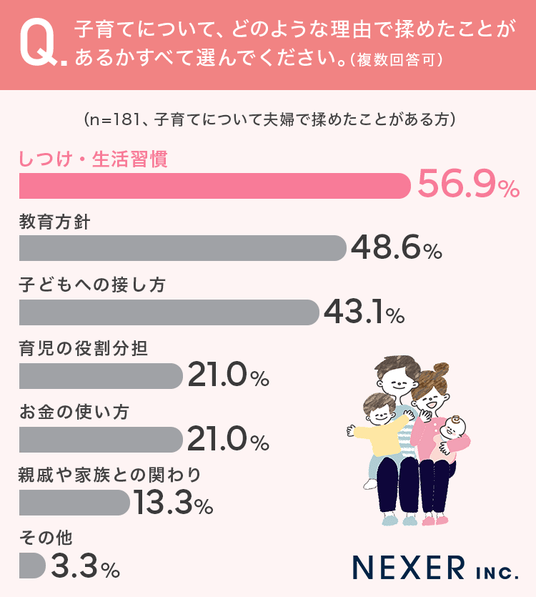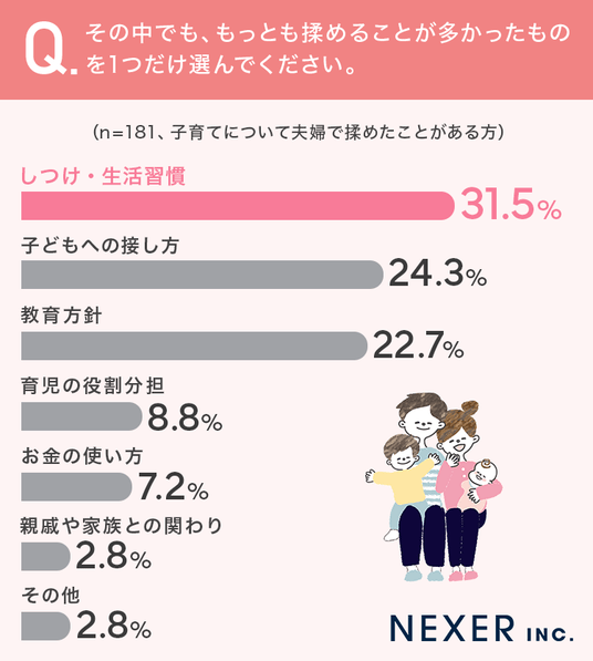 夫婦間の揉めごとは、「しつけや接し方」といった日常的な価値観の相違から、「教育方針」などの子どもの将来に関わる重大なテーマまで多岐にわたることが分かりました。