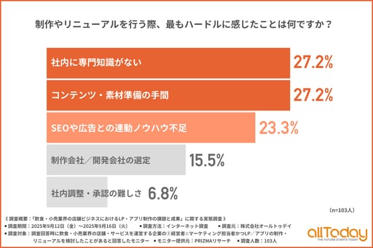 「制作やリニューアルを行う際、最もハードルに感じたこと」について尋ねたところ、『社内に専門知識がない(27.2%)』『コンテンツ・素材準備の手間(27.2%)』が同率で最も多く、『SEOや広告との連動ノウハウ不足(23.3%)』となりました。