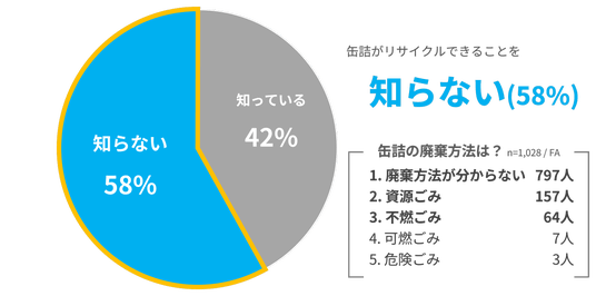 缶詰容器のリサイクルについて質問したところ、「知らない」と回答した人は全体の58%に上り、過半数を占める結果となりました。また、廃棄方法についても「分からない」と答えた人が796人と最も多く、缶詰の正しい廃棄方法について、消費者への周知が十分に行き届いていない現状が浮き彫りとなっています。