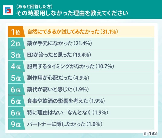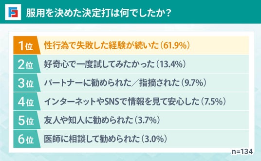 服用に抵抗を感じていた男性が多かったものの、「性行為での失敗が続いた」という経験が、最終的な服用を決める最大の要因となりました。このことは、精神的なストレスや自信の喪失が、治療を開始する上で重要な後押しになったと考えられます。