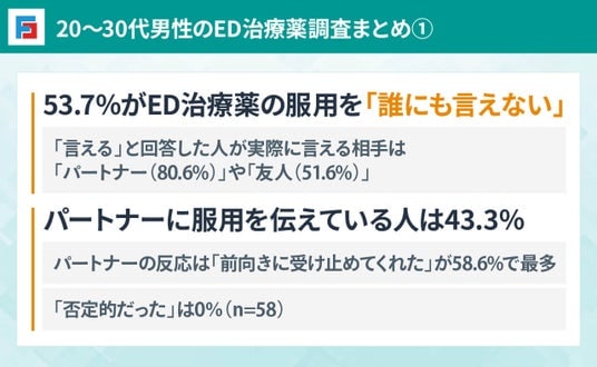 調査の結果、20~30代でED治療薬を服用している男性の半数以上が服用を「誰にも言えない」と考えている実態が明らかになりました。一方で、服用を打ち明けた際にパートナーから否定的な反応があったという回答は、0%でした。