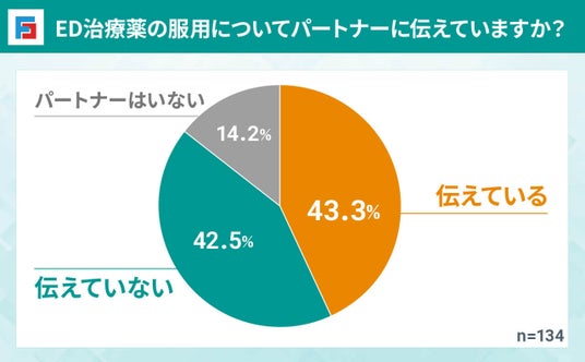 ED治療薬の服用についてパートナーに伝えているか聞いたところ、「伝えている」「伝えていない」がほぼ同数となりました。