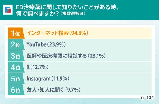 ED治療薬について知りたいことがある場合、9割の人が「インターネット検索」を利用していることが分かりました。そのうえで、Youtubeや医療機関、SNSなどと併用して情報収集する人が多いようです。