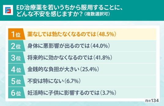 ED治療薬を若いうちから服用することに対し、半数近くの人が「薬なしでは勃たなくなるのでは」、「身体に悪影響が出るのでは」といった不安を抱えていることが明らかになりました。また、「将来的に効かなくなるのでは」という懸念も4割くらいの人が持っています。