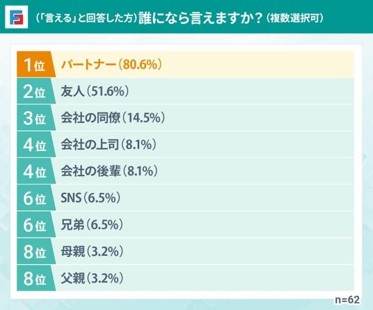 ED治療薬を服用していることを「言える」と回答した男性のうち、言える相手として最も多かった回答は「パートナー」でした。多くの場合、ED治療薬を服用する目的がパートナーとの性行為にあるため、その相手に対しては治療の意思や状況を伝えやすいことが考えられます。