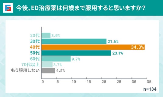 ED治療薬の服用は「40代」までと考えている人が最も多い結果となりました。20~30代の若年層は、ED治療薬を長期的に使用するのではなく、一時的な治療として捉えている傾向が見受けられます。