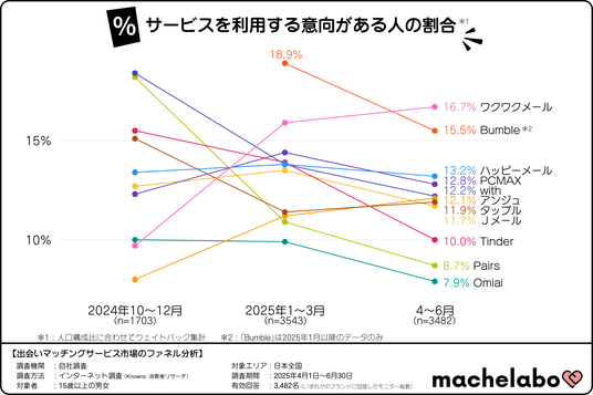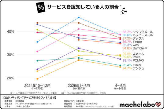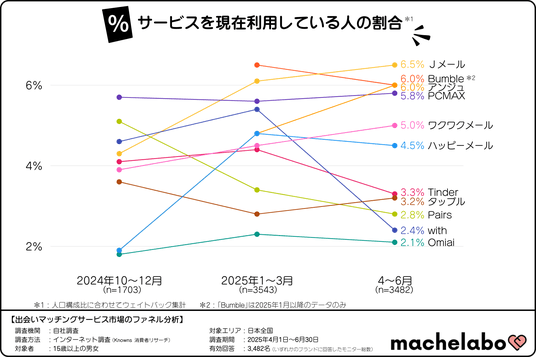 株式会社マシェバラトークが運営するオウンドメディア『マシェラボ』( https://machetalk.jp/media/ )は、2025年4月~6月期の出会い・マッチングサービスの利用動向について、調査を実施しました。