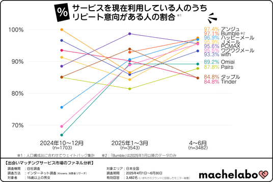 2025年4月~6月期の調査では、「アンジュ」が97.4%で継続利用意向率のトップとなりました。2位は「Bumble」が97.1%、3位は「ハッピーメール」が96.9%と続いており、多くのサービスで95%を超える高い継続利用意向を示す結果となっています。