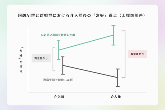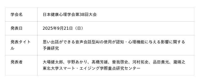 これは、心理的効果を対照群を設け介入試験で実証した国際的にも先駆的な研究で、そこから得られた結果は、AIとの会話による回想体験が気分改善に寄与する可能性を初めて提示したものになります。また、新たな科学的知見として、日本健康心理学会第38回大会(2025年9月21日、桜美林大学新宿キャンパス)にて発表されました。