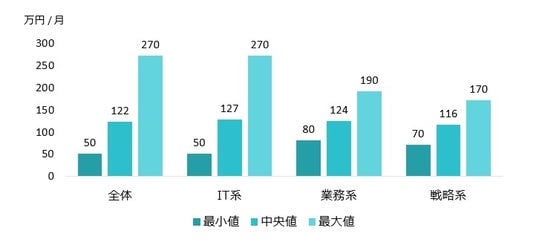カテゴリー別に見るとIT系案件の報酬が平均で最も高く、業務系、戦略系の順に続くという前回とは異なる結果となりました。