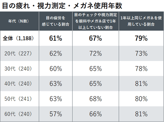 全世代の6割が目の疲労を実感、7割が病院やメガネ店で1年以上視力測定を受けず
