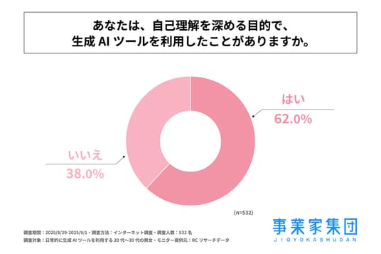 株式会社事業家集団(本社:東京都千代田区、代表取締役:田辺 由美子)が運営する「アンチ図鑑」は、日常的に生成AIツールを利用する20代~30代の男女を対象に「生成AIツールを利用した自己理解の実態に関する調査」を実施しました。この調査から、日常的に生成AIツールを利用する20代~30代の男女が、自己理解を目的に生成AIツールをどのように利用し、どのような結果を得ているかなどが明らかになりました。