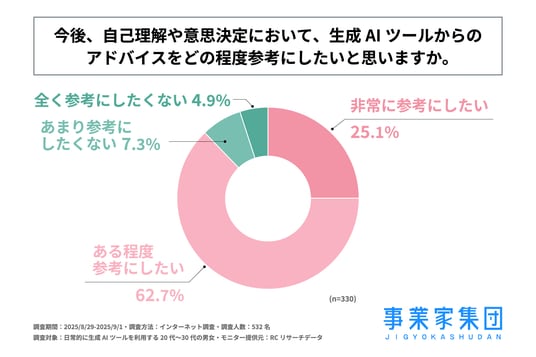 自己理解を深める目的で生成AIツールを利用した人の9割弱が、今後の自己理解や意思決定において、生成AIツールからのアドバイスを少なからず参考にしたいと考えている