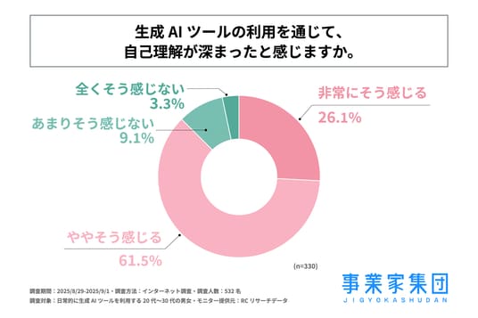 自己理解を深める目的で生成AIツールを利用した人の9割弱が、生成AIツールの利用を通じて、少なからず自己理解が深まったと感じている
