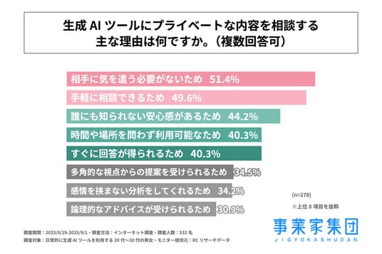 生成AIツールにプライベートな内容を相談した人の主な理由は、「相手に気を遣う必要がないため」や「手軽に相談できるため」