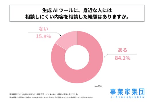 また、自己理解を深める目的で生成AIツールを利用したことがあると回答した人を対象に「生成AIツールに、身近な人には相談しにくい内容を相談した経験はあるか」を尋ねる設問への回答では、「ある」が84.2%、「ない」が15.8%という結果になりました。この結果から、自己理解を深める目的で生成AIツールを利用した人の8割強が、生成AIツールに、身近な人には相談しにくい内容を相談した経験があることが明らかになりました。