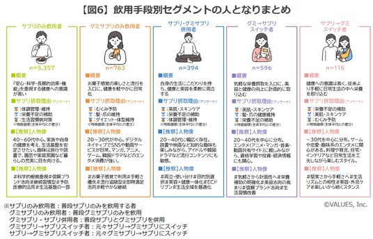 その他のセグメントについても、サプリのみ飲用者と同様に人物像について整理しており、図6では、各セグメントの人となりの概要をまとめています。各Web上での実行動からわかる特徴や人物像・サプリ飲用スタンスを推察した結果を整理しました。すると、グミサプリを飲用したことのあるセグメント(グミサプリのみ飲用者を含む)に関しては、外見(むくみ予防・髪・爪の維持)や美容を目的に飲用していることが分かりました。また、年齢層はサプリのみ飲用者と比べて若年層が多い傾向にありました。