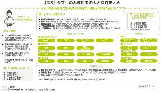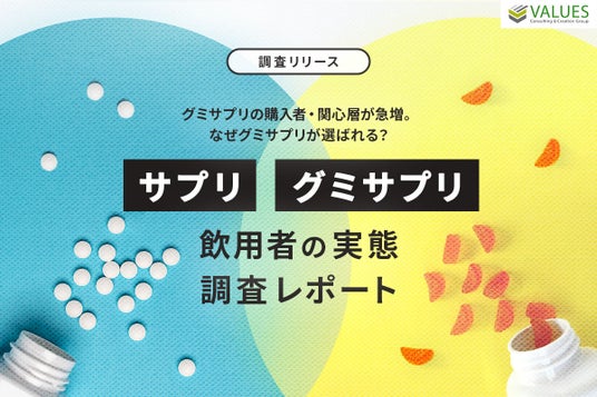 インターネット行動ログ分析によるマーケティング調査・コンサルティングサービスを提供する株式会社ヴァリューズ(本社:東京都港区、代表取締役社長:辻本 秀幸、以下「ヴァリューズ」)は、国内の18歳以上の男女38,015人を対象に、飲用しているサプリメントに関する消費者アンケート調査を実施しました。また、Web行動ログとアンケートデータを活用した分析ツール(「Dockpit(ドックピット)」「Perscope(ペルスコープ)」)を用いて、サプリメント市場を調査。サプリメント利用者を種類別にセグメント分けし、それぞれの価値観や特徴的な検索ワードなどを分析しました。