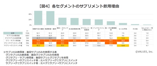 また、グミサプリ・サプリ併用者は他のセグメントと比べて、飲用理由に健康・美容をあげる人の割合が高く、グミ→サプリスイッチ者は美容や効能を意識し始めたビギナー層、サプリ→グミスイッチ者は続けやすさを求める継続派と整理できます。