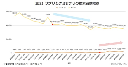 サプリ関連の検索者とグミサプリ関連の検索者を2年間(2023年8月~2025年7月)で集計すると、サプリ関連検索は落ち着きを見せ、グミサプリは2025年2月から上昇トレンドであることが分かりました。サプリ検索は、生活に馴染んでいることとコロナ禍以降の健康意識の変容の影響で、検索者数が変わるのかもしれません。グミサプリはSNSでの“バズり”やコンビニエンスストア・ドラッグストアなど販売チャネルの幅広さから、話題性があり上昇トレンドになっていると推察されます。購入者推移と併せて、グミサプリは話題性があり、サプリメント市場において影響度が高くなりつつあることが考えられます。