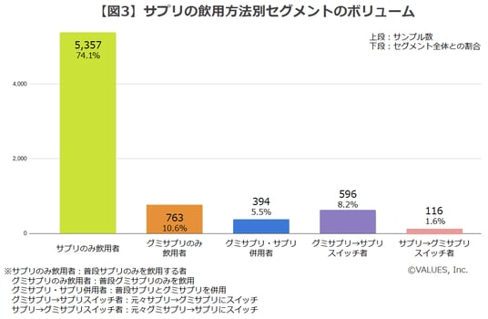 サプリメントの飲用方法ごとにセグメントを作成し、そのサンプル数を確認しました。従来から親しまれているサプリのみを飲用している人は調査対象者全体の4人に3人の割合の約74%であることが分かりました。グミサプリを続けて飲用している人(他4セグメントで)は全体の約26%で4人に1人となり、グミサプリ飲用の習慣が定着してきていることが考えられます。
