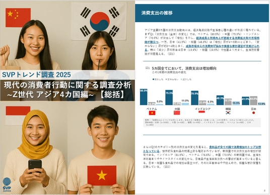 会員制マーケットリサーチサービスを提供している、株式会社SVPジャパン(本社:東京都中央区、代表取締役社長:橋本 雅、以下「SVPジャパン」)は、『現代の消費者行動に関する調査分析~Z世代 アジア4カ国編~』と題し、経済成長やデジタル化の進展が著しいアジア4カ国(中国、韓国、インドネシア、ベトナム)のZ世代を対象に、消費行動の調査・分析を実施。今回はその総括として、各国の消費行動に関する特徴や日本のZ世代との共通点・相違点を明らかにする。