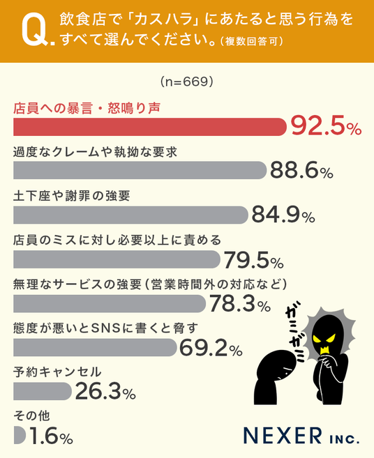 中でも、飲食店でもっとも「カスハラ」にあたると思う行為は何か、1つだけ選んでもらいました。