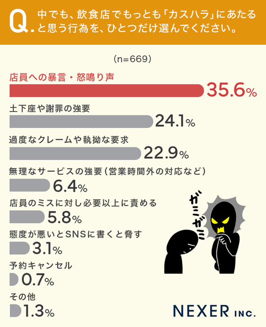 最も多くの方が「店員への暴言・怒鳴り声」を挙げ、35.6%に達しました。