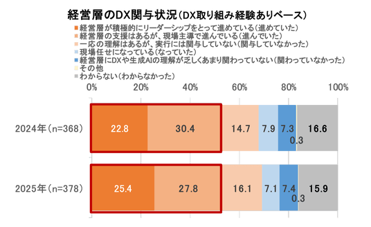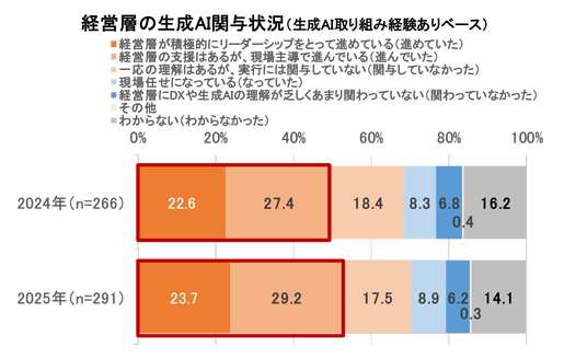 ・一方「現場任せになっていた」「経営層の理解が乏しく関わっていない」「その他」「わからない」の合計は、DXで30.7%、生成AIで29.5%と3割近くあり、経営層の関与が今後の取り組み度合いに影響を与える可能性があると考えられます。