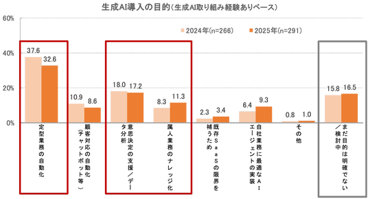 ・生成AI導入の目的は「定型業務の自動化」が最多だが減少傾向にあり、「意思決定の支援」「属人業務のナレッジ化」などの高度なレイヤーでの活用も広がりつつあることが見て取れます。