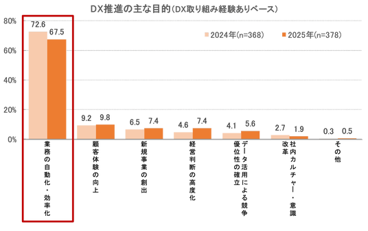 【DX/AI調査レポート】DXの目的は7割弱が守りの「効率化」に留まる、一方で生成AIは効率化から「高度活用」へ進化の兆し。―経営層の関与は5割程度で、今後の企業間格差の分岐点となる可能性―