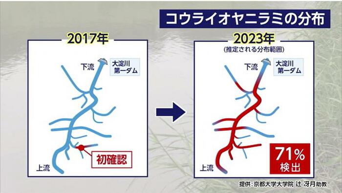 魚が水中に出した糞などのDNAから、生息域がどれだけ広がっているか調査したところ、2017年の初確認からわずか6年後…。都城市の大淀川水系の71%で、コウライオヤニラミのDNAが確認された。