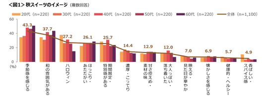 秋スイーツのイメージは、「季節感を感じる」が43.3%で最も高く、「和の雰囲気がある」が37.7%、「ハロウィン」が27.2%で続く。