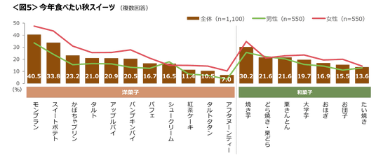洋菓子では「モンブラン」「スイートポテト」「かぼちゃプリン」、和菓子では「焼き芋」「どら焼き・栗どら」「栗きんとん」がTOP3。特に「モンブラン」「スイートポテト」「かぼちゃプリン」「パンプキンパイ」は女性に人気がある。<図5>