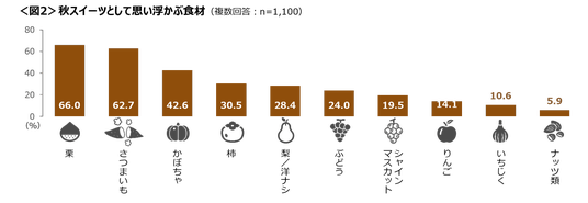 秋スイーツとして思い浮かぶ食材は、「栗」「さつまいも」が6割台、「かぼちゃ」が4割。