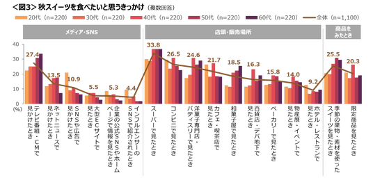 20代は「SNSや広告」「インフルエンサーのSNSでの紹介」といったSNS関連、40代は「コンビニ」「洋菓子専門店」「カフェ・喫茶店」「百貨店・デパ地下」などの店頭、50~60代は「テレビ番組・CM」が高め。<図3>